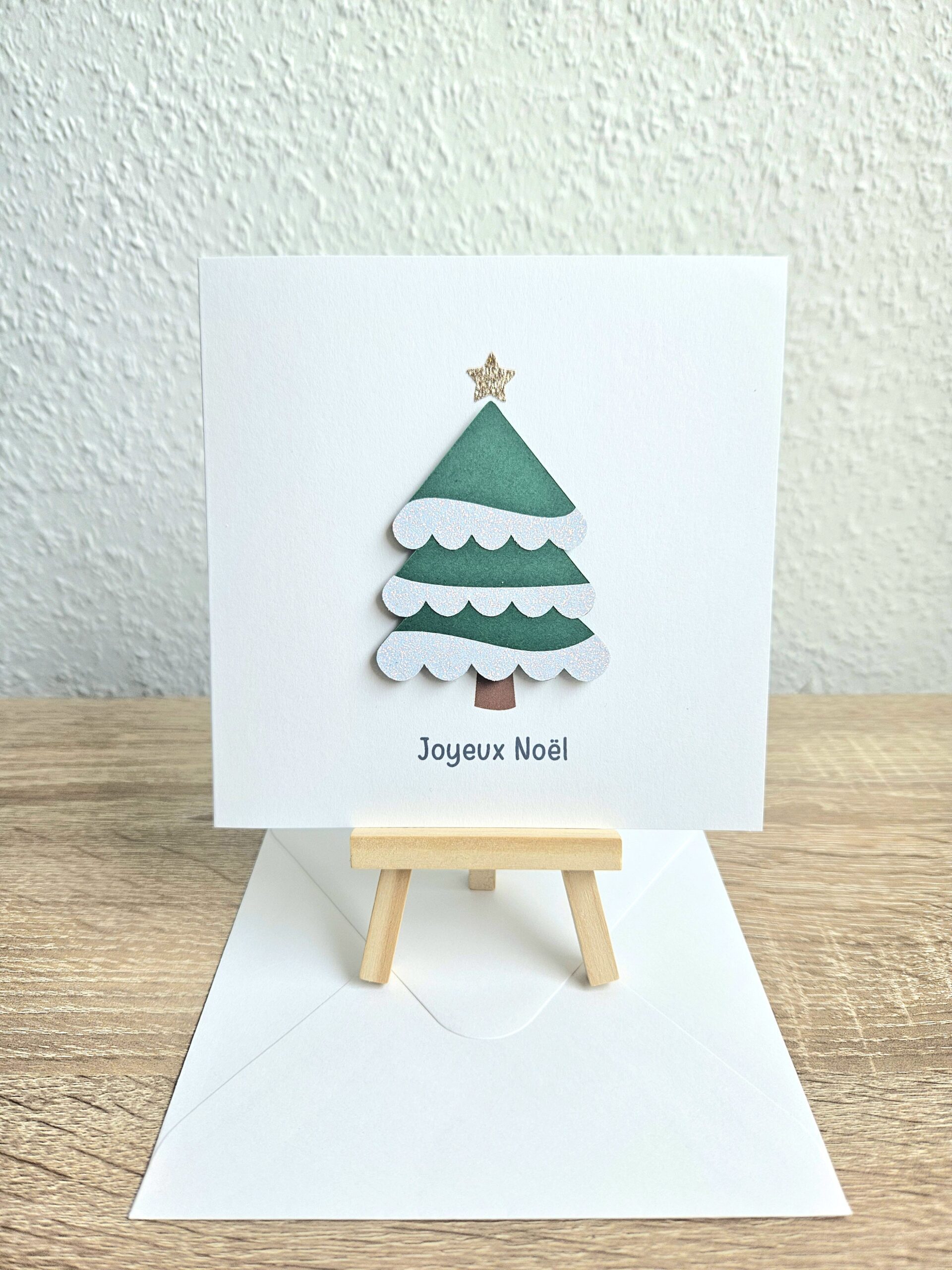 Son design minimaliste met à l’honneur un joli sapin de papier en relief, surmonté d’une étoile pailletée et délicatement posé sur un fond blanc épuré.