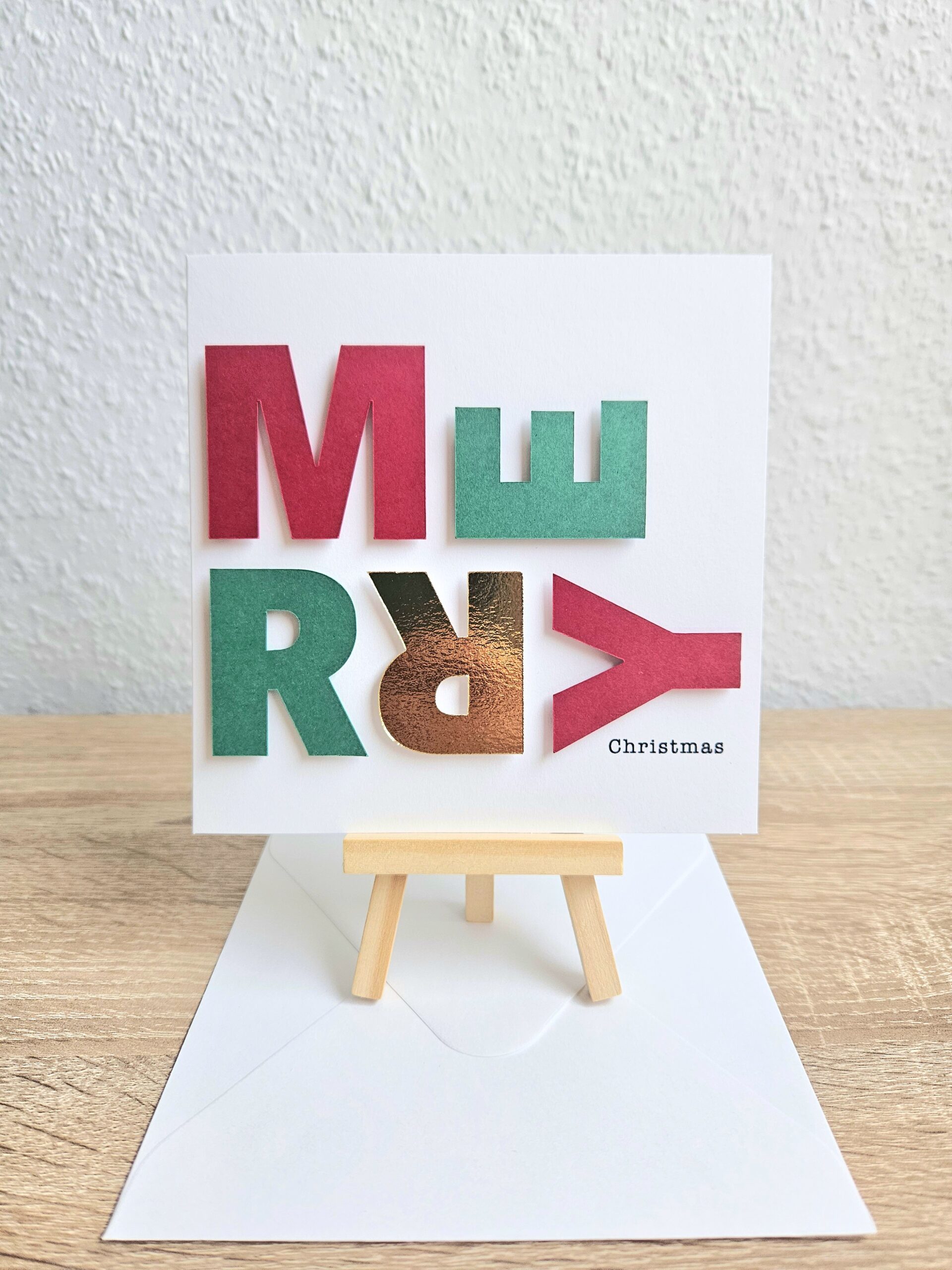 Les lettres MERRY se détachent en relief dans des teintes rouge, vert et doré métallisé pour un rendu à la fois moderne, élégant et joyeux.