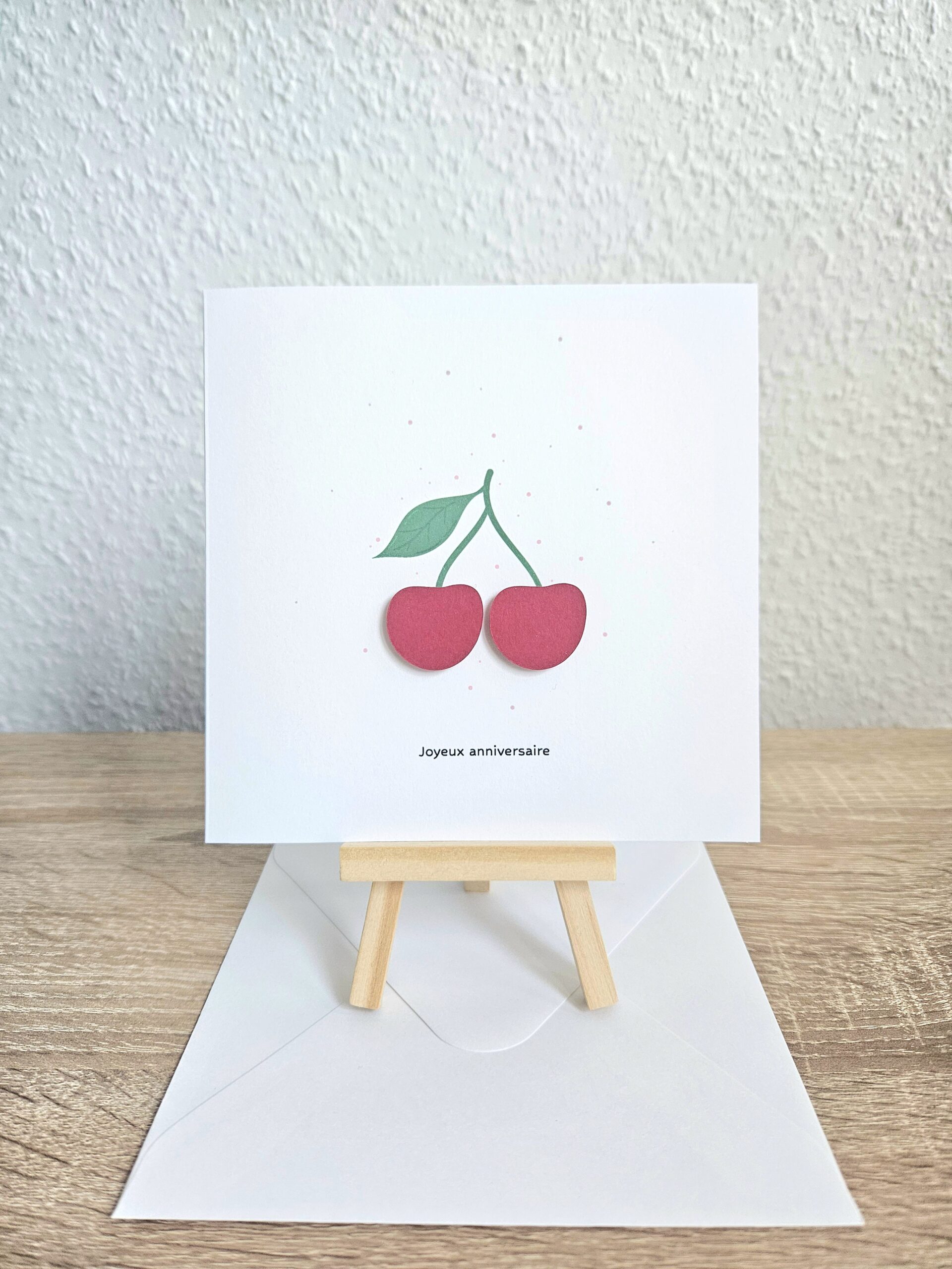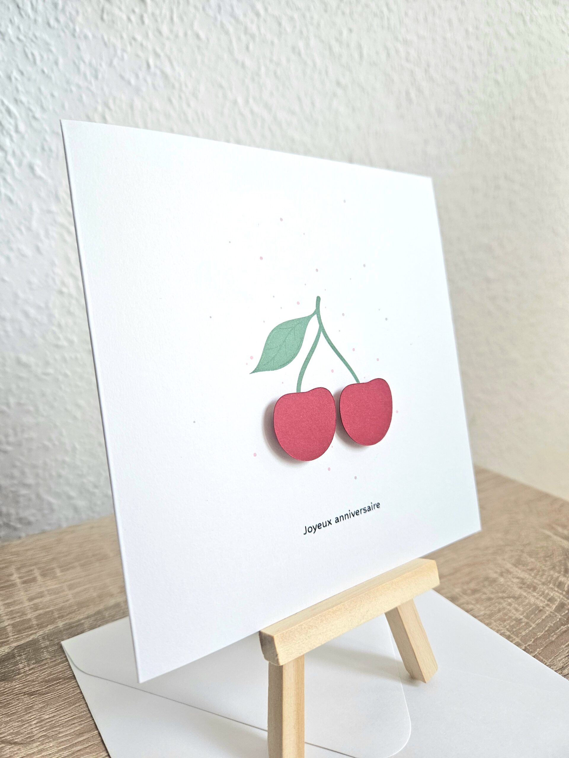 Deux cerises rouges, finement découpées et collées en relief, apportent une touche ludique et gourmande à l’ensemble. Leurs couleurs vives contrastent subtilement avec le fond blanc, ponctué de petits détails discrets qui renforcent la poésie de la création.